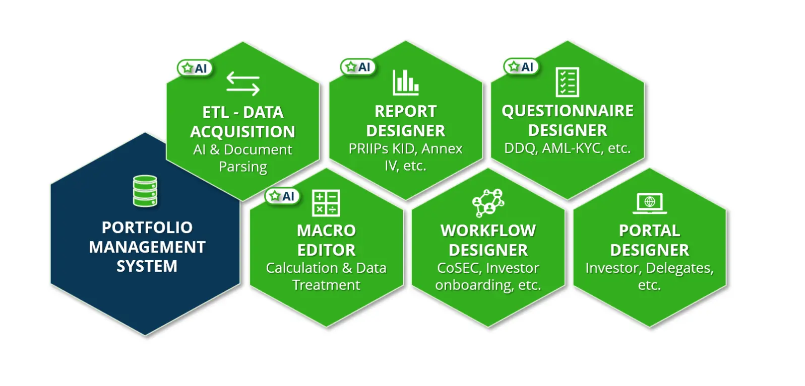 Our ETL and Macro technologies allow you to design first your Data Management then, the Investment, Risk, Compliance and Private Equity functionalities you need for your business – operated by you or by your delegates in your system.